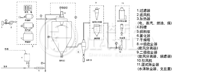 電池材料噴霧干燥設(shè)備是將原料用霧化器分散成霧滴,并用熱空氣(或其他氣體)與霧滴直接接觸的方式而獲得粉粒狀產(chǎn)品的一種干燥過程??諝饨?jīng)過濾和加熱,進(jìn)入干燥器頂部熱風(fēng)分配器,熱空氣呈螺旋狀均勻地進(jìn)入干燥室,料液經(jīng)塔體頂部的高速離心霧化器,旋轉(zhuǎn)噴霧成極細(xì)微的霧狀液珠,霧滴和熱空氣接觸,混合及流動同時進(jìn)行傳熱傳質(zhì),在極短的時間內(nèi)可干燥為成品,霧滴及熱空氣的流向有并流,逆流及混合流,接觸方式不同,對干燥塔內(nèi)的溫度分布,霧點(或顆粒)的運動軌跡,顆粒在干燥塔中的停留時間及產(chǎn)品性質(zhì)等均有很大影響。